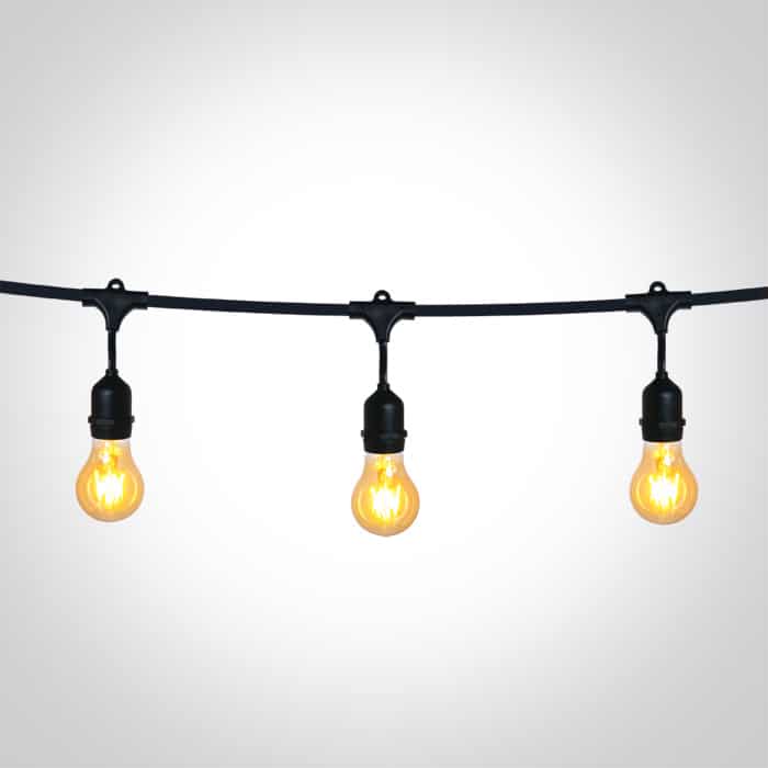 Guirlande lumineuse de 8,5 m avec 15 douilles E27, espacées de 50 cm. Conforme à la norme EN60598-1 et à toute autre norme spécifique.